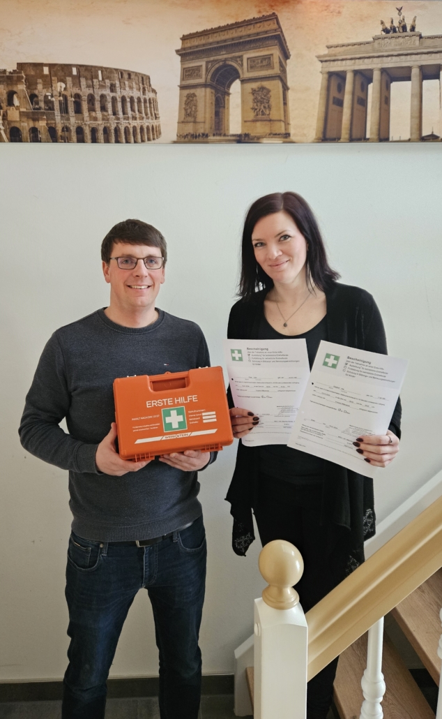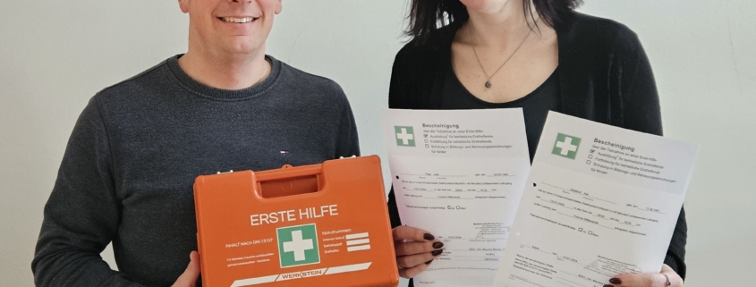 Am 13.01.24 haben wir unser Wissen zum Thema „Erste-Hilfe“ durch die MSO (Medizinische Service Organisation) aufgefrischt und sind nun mit zwei Ersthelfern im Betrieb gut für mögliche Ernstfälle vorbereitet.